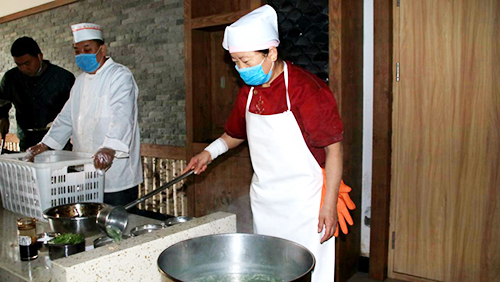 今天是五一運營的第三天,她又出現(xiàn)在了工作崗位上,經(jīng)理讓她休息幾天,而她固執(zhí)的包著紗布一直工作著,她說:“五一長假,是運營最忙、后勤最忙的時候,我不能請假”。她堅毅的眼神讓我們?yōu)橹畡尤荩浞终宫F(xiàn)了長白山旅游股份人的責任和擔當。食堂的工作是艱苦的,經(jīng)常在特定的工作環(huán)境里,潮濕、熱氣、冷水鋪面而來,這是每一個后廚工作人員不可避免的,刷碗一站就是兩個小時,前面熱氣重,后面被蒸車烤,滿臉的汗水是她們辛苦最好的見證。食堂員工每天吃飯的時間都在13:30分以后,每次都在經(jīng)理的督促下才坐下來吃飯,因為她們每天12小時無休止的勞動讓她們不敢坐下來,因為那疲憊的身體一旦坐下來就再也不愿站起來,但她們無怨無悔。