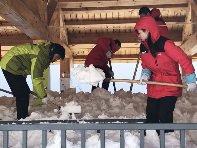 2017年3月5日,40余名志愿者在北景區老山門候車亭前集合,前往瀑布回廊清雪。長白山由于特殊的地理位置和氣候,冬季雪期長、雪量大,經過一年積淀,回廊內積雪平均厚度已達1.5米,面對艱巨的任務,志愿者們用高漲的熱情對抗天寒地凍,經過個6小時的奮戰,下午三點回廊積雪被清掃一空,為迎接游人的到來做好了準備。