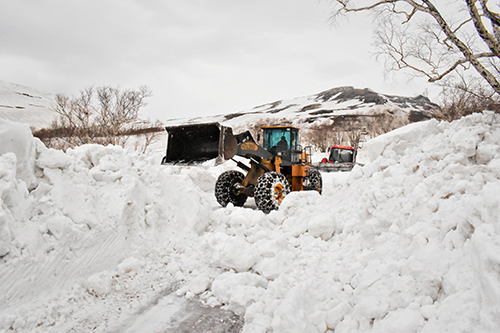 長白山主峰氣候極端復(fù)雜,風(fēng)霜雪雨,瞬息萬變,時常發(fā)生剛剛清理過的路段,瞬間又被飛雪覆蓋,部分主峰道路積雪厚度超過3米,鏟車無法就地鏟舉積雪,推送距離達幾百米,清雪難度可想而知。為節(jié)省時間、降低油耗,隊員們憑借豐富的經(jīng)驗,準(zhǔn)確判斷公路和護欄位置,起早貪黑、加足馬力、就地進餐,奮力搶抓清雪進程。他們既要承擔(dān)高強度工作任務(wù),又要承受積雪反射紫外線對皮膚造成的傷害,人員和設(shè)備都經(jīng)受著嚴(yán)峻考驗。
