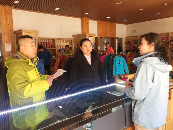 活動中支委班子成員及相關人員來到北景區人員密集場所,以匿名問卷調查形式,對景區內是否存在,欺行霸市、欺客瞞客、不明碼標價、誘導消費、擾亂景區秩序現象,進行摸排。隨后來到景區各經營網點走訪并就掃黑除惡斗爭的政策、內容及舉報方式、舉報渠道,向經營商戶進行講解,希望商戶們能以掃黑除惡專項活動為契機,為維護長白山旅游品牌形象,打造一個優質的營商環境共同努力。