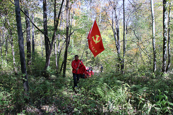 在隨風飄揚的黨旗下,全體黨員前往老黑河遺址,深入密林深處,崎嶇的山路,行走在山林草莽之間,感受當時的艱苦斗爭環境,體驗革命烈士走過的抗聯路。